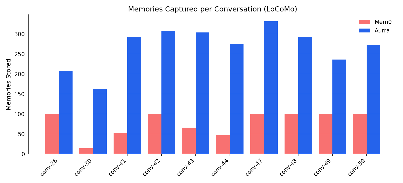 - Aurra's extraction uses Claude Opus. Mem0's extraction stack is closed-source. Different LLM choice may explain part of the quality difference.